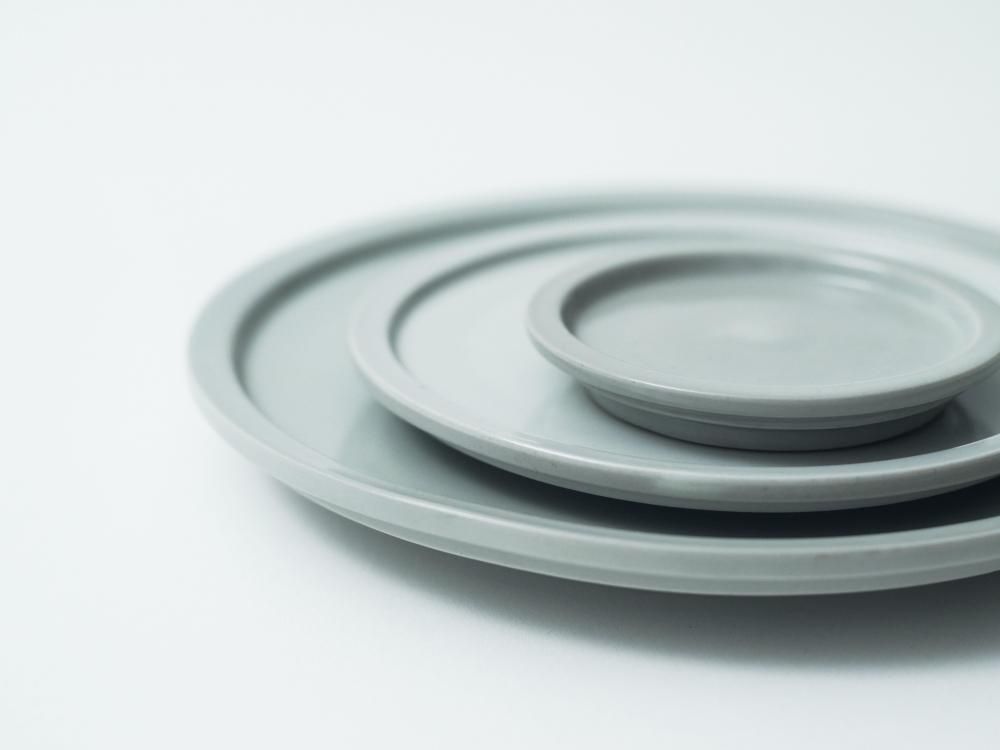 鉄分を含む土の上に、無色透明の釉薬を掛け、窯の中で変化することで淡いブルーグレーの色を纏っています。